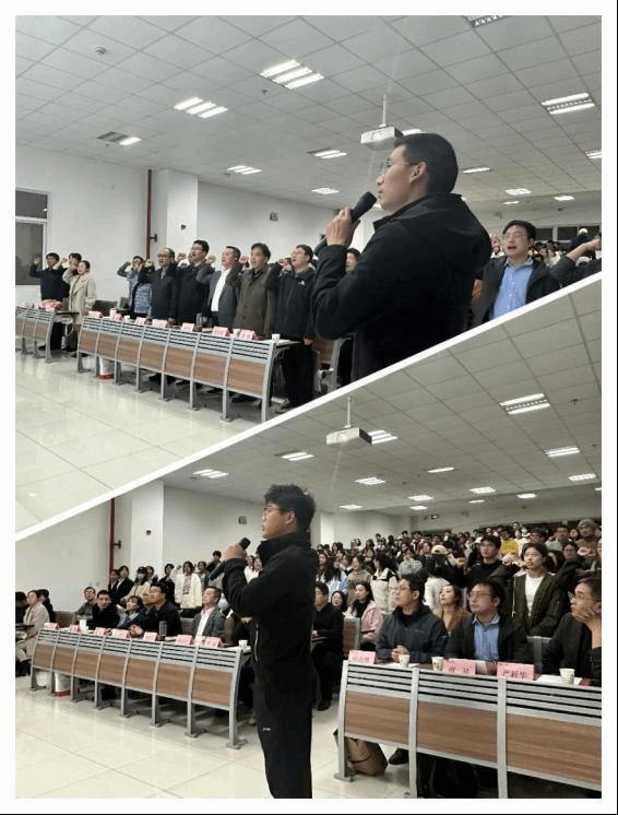 田祎老师通过对音乐《理想》的分享为全体师生诵读与分享了一段经典,引导全体师生心怀理想、不懈奋斗。全体师生也都备受鼓舞,与会教师在王程老师带领下进行了庄严的宣誓,与会学生在刘奕喆同学的带领下进行了郑重承诺。